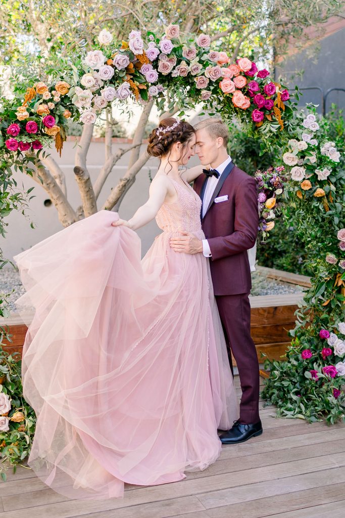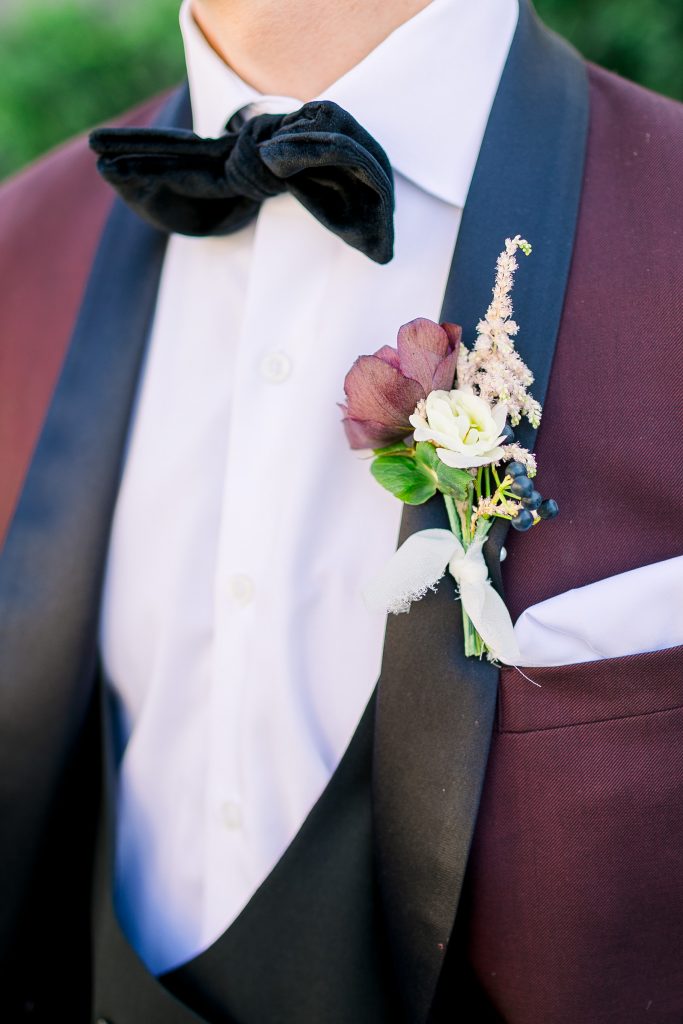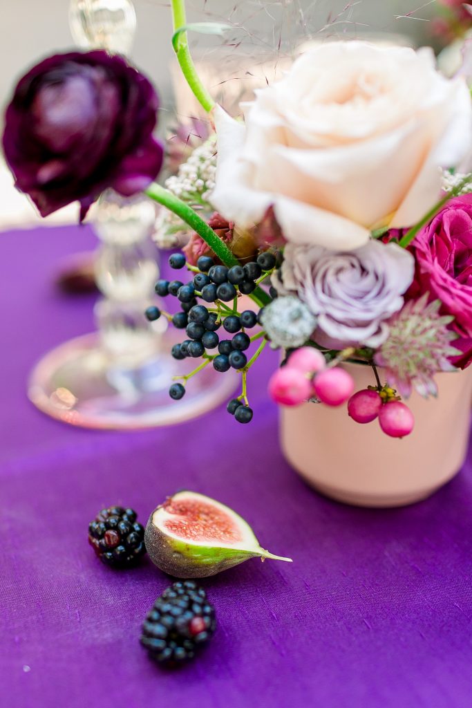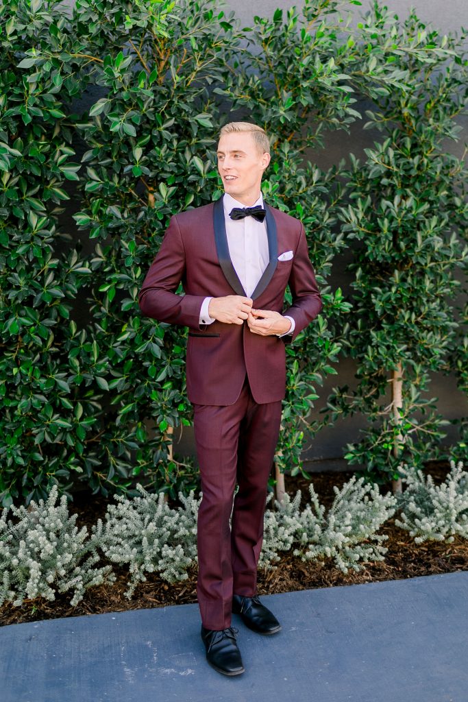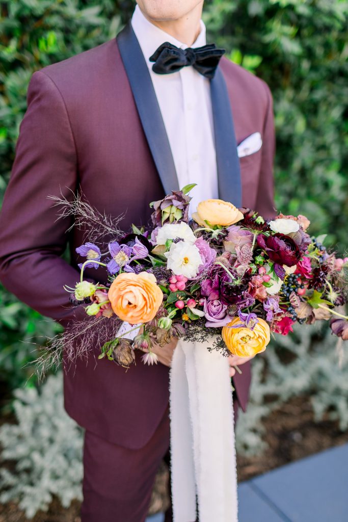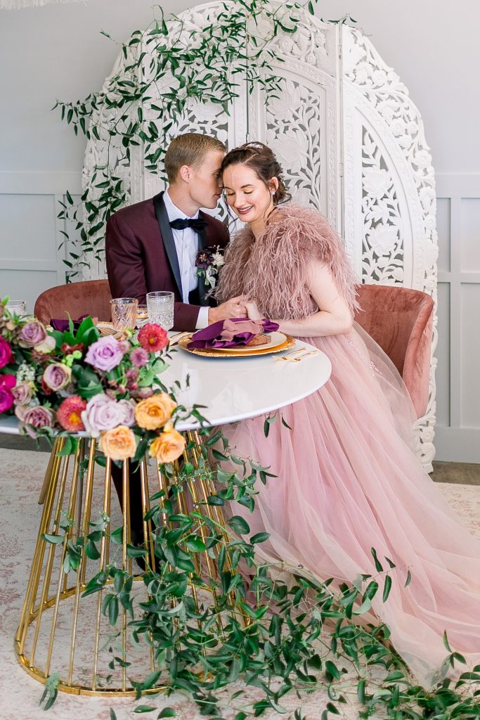 It all began with purple, thanks to this lovely invitation suite by Castlefield Design, combining a plum watercolor background and white ink lettering. Alicia C. Creative styled the bride to modern perfection, pairing a blush beaded wedding dress by Jana Sofia Bridal with a dusty rose feather bolero by Le Nuage Luxe. The stunning colors created a bridal look to die for, with the beautiful accents of sparkles and feathers adding fresh textures. Hair stylist Bostylist and Makeup artist: LYS Beauty played off the gorgeous gown and feathered jacket to create playful and elegant beauty inspiration. She crowned the braided updo with a headpiece by Peaches and Love USA for a touch of sparkle. An Elton John-inspired shoot is no place for traditional groom’s wear, and this burgundy suit from Friar Tux Shop knocked it out of the park! The look is wearable for even the most solid of groom’s, with a traditional cut and rich color to add a little extra personality. It looked picture perfect against the plum, yellow, and berry bouquet by Peonies and Petals.