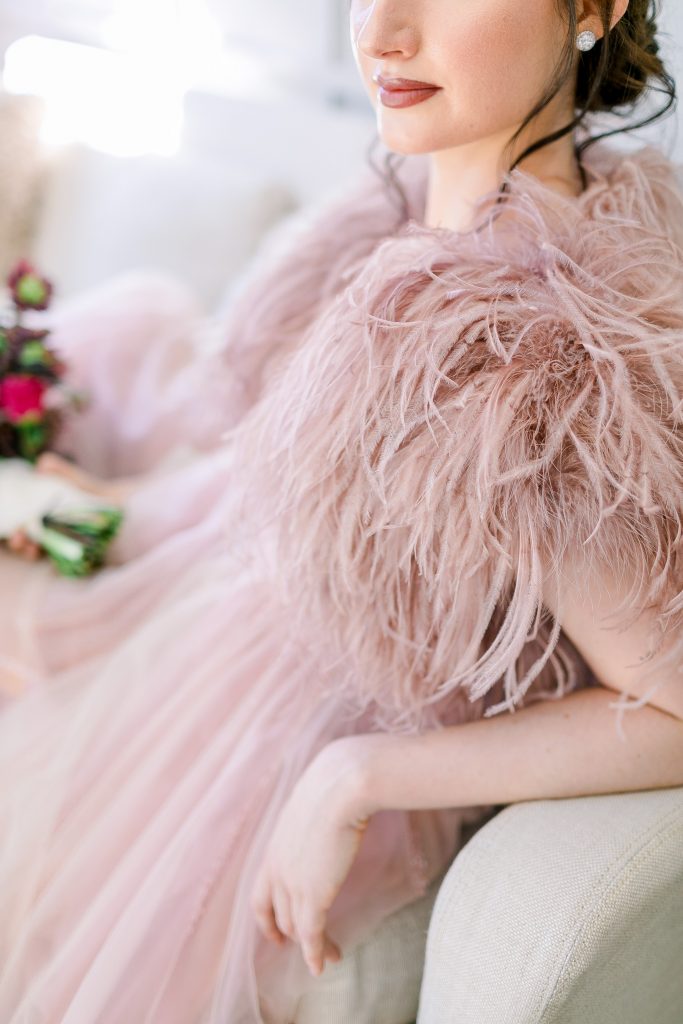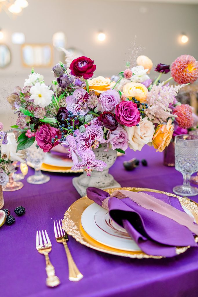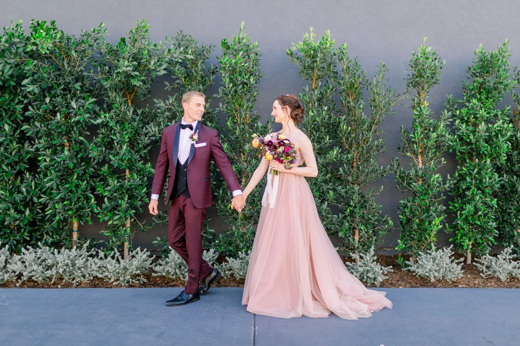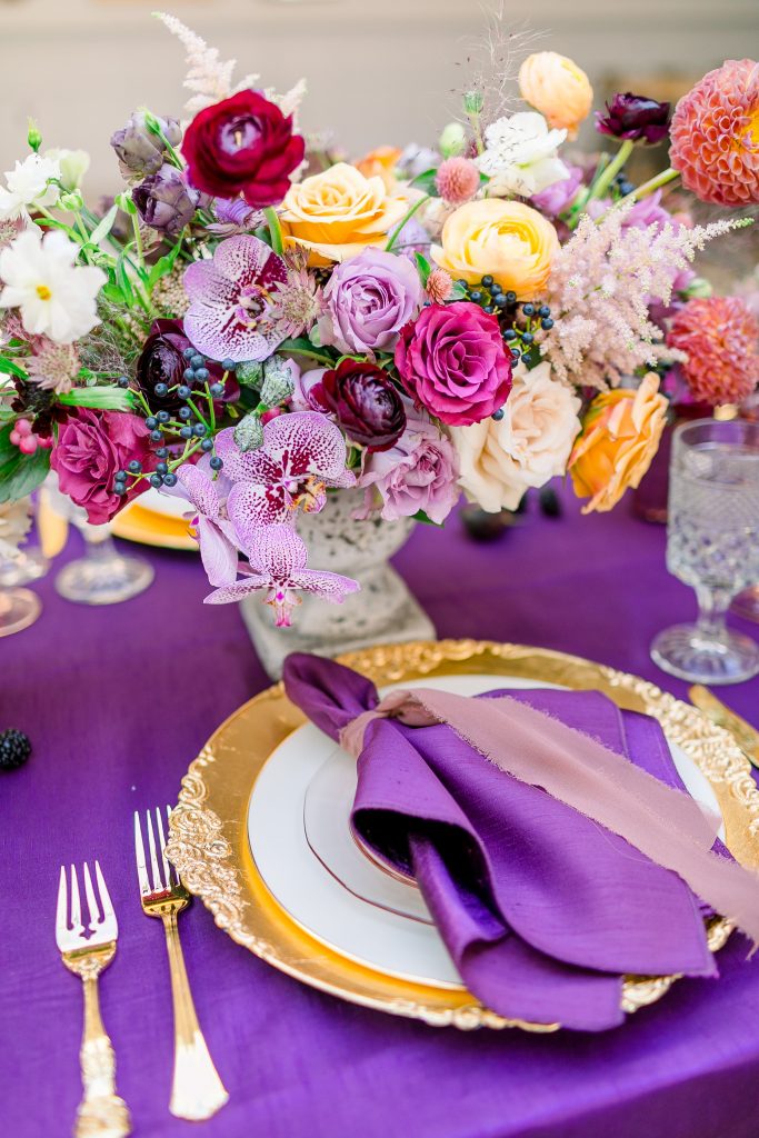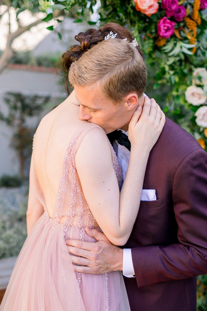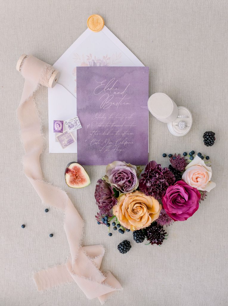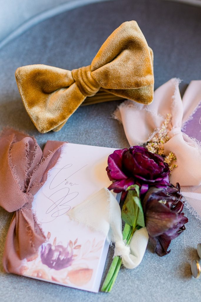 It all began with purple, thanks to this lovely invitation suite by Castlefield Design, combining a plum watercolor background and white ink lettering. Alicia C. Creative styled the bride to modern perfection, pairing a blush beaded wedding dress by Jana Sofia Bridal with a dusty rose feather bolero by Le Nuage Luxe. The stunning colors created a bridal look to die for, with the beautiful accents of sparkles and feathers adding fresh textures. Hair stylist Bostylist and Makeup artist: LYS Beauty played off the gorgeous gown and feathered jacket to create playful and elegant beauty inspiration. She crowned the braided updo with a headpiece by Peaches and Love USA for a touch of sparkle. An Elton John-inspired shoot is no place for traditional groom’s wear, and this burgundy suit from Friar Tux Shop knocked it out of the park! The look is wearable for even the most solid of groom’s, with a traditional cut and rich color to add a little extra personality. It looked picture perfect against the plum, yellow, and berry bouquet by Peonies and Petals.
