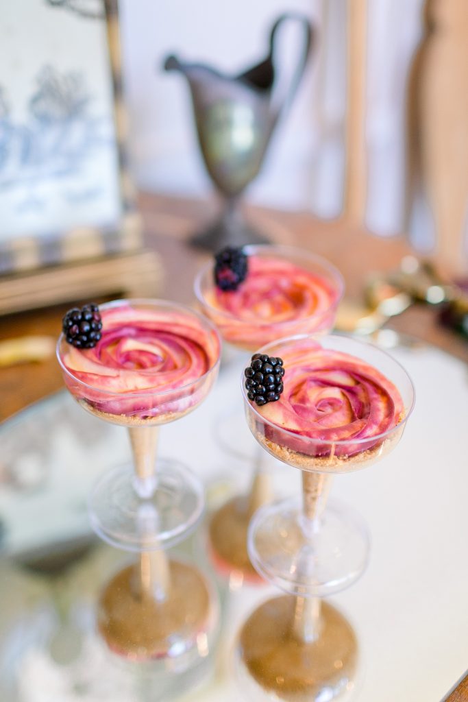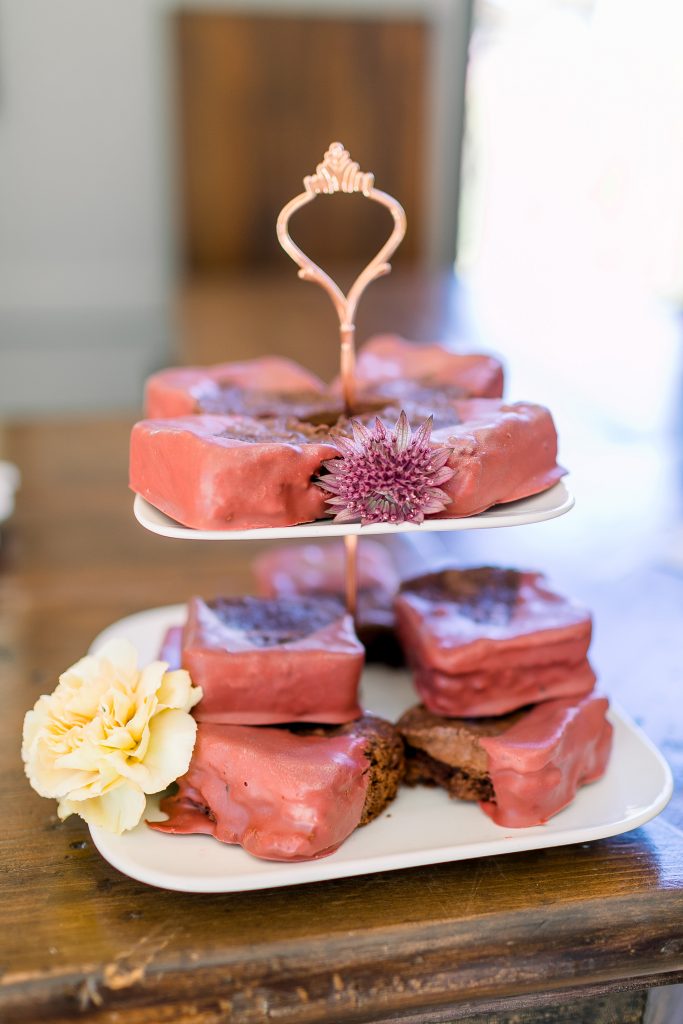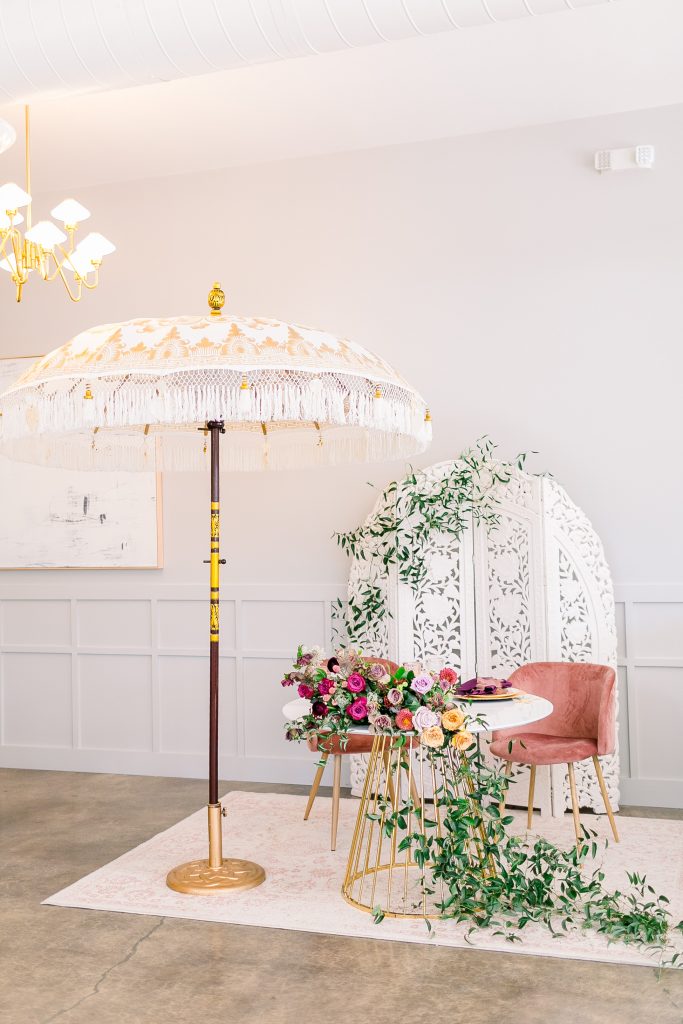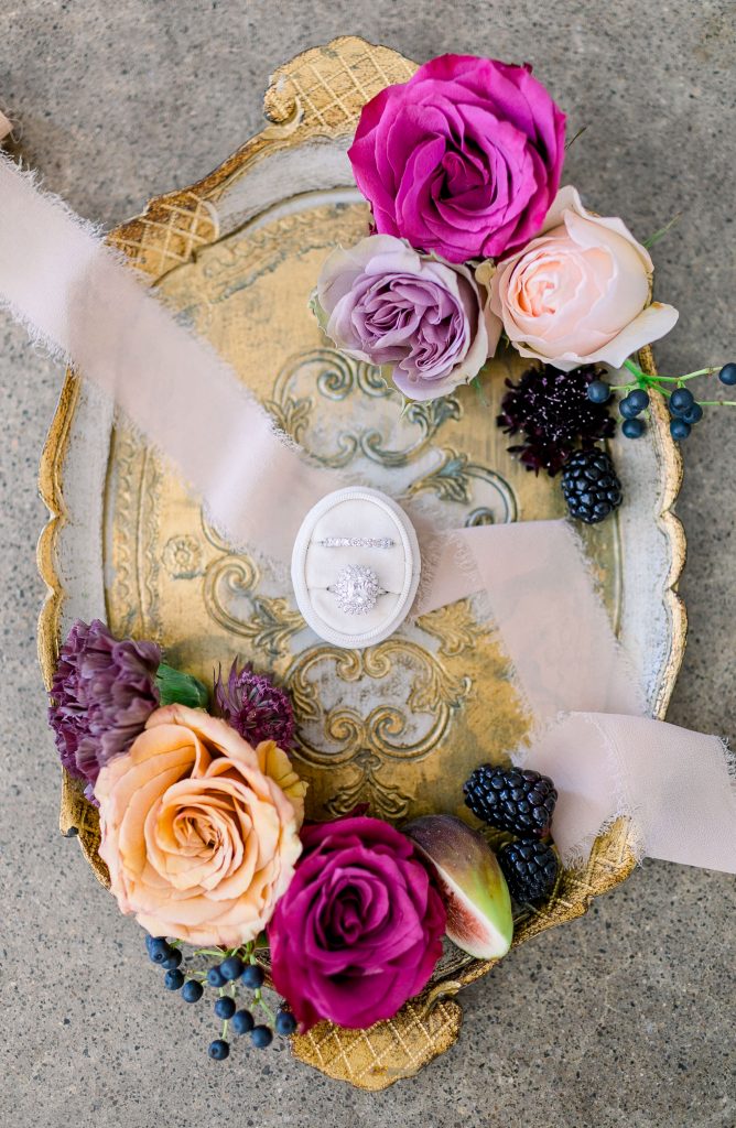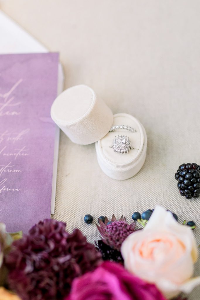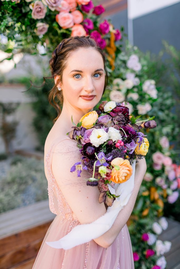 It all began with purple, thanks to this lovely invitation suite by Castlefield Design, combining a plum watercolor background and white ink lettering. Alicia C. Creative styled the bride to modern perfection, pairing a blush beaded wedding dress by Jana Sofia Bridal with a dusty rose feather bolero by Le Nuage Luxe. The stunning colors created a bridal look to die for, with the beautiful accents of sparkles and feathers adding fresh textures. Hair stylist Bostylist and Makeup artist: LYS Beauty played off the gorgeous gown and feathered jacket to create playful and elegant beauty inspiration. She crowned the braided updo with a headpiece by Peaches and Love USA for a touch of sparkle. An Elton John-inspired shoot is no place for traditional groom’s wear, and this burgundy suit from Friar Tux Shop knocked it out of the park! The look is wearable for even the most solid of groom’s, with a traditional cut and rich color to add a little extra personality. It looked picture perfect against the plum, yellow, and berry bouquet by Peonies and Petals.