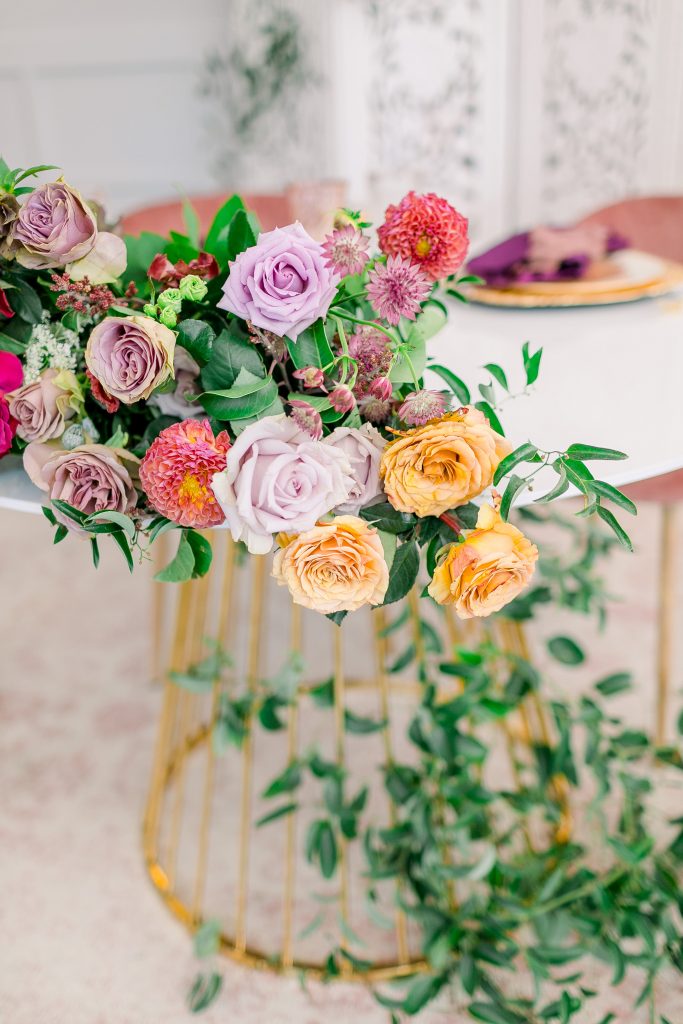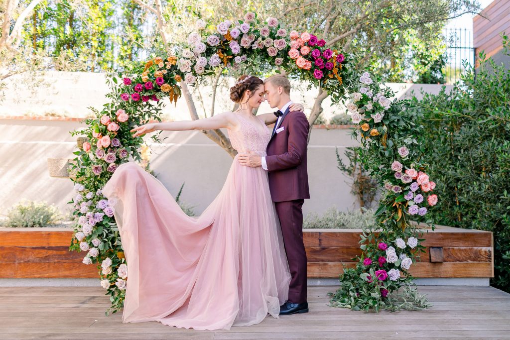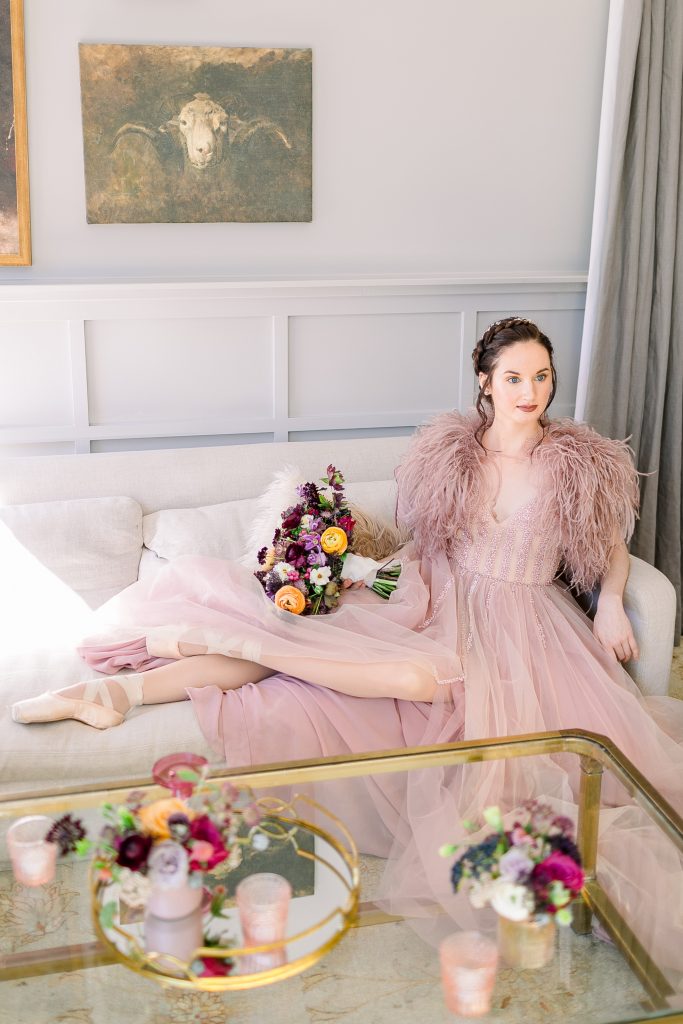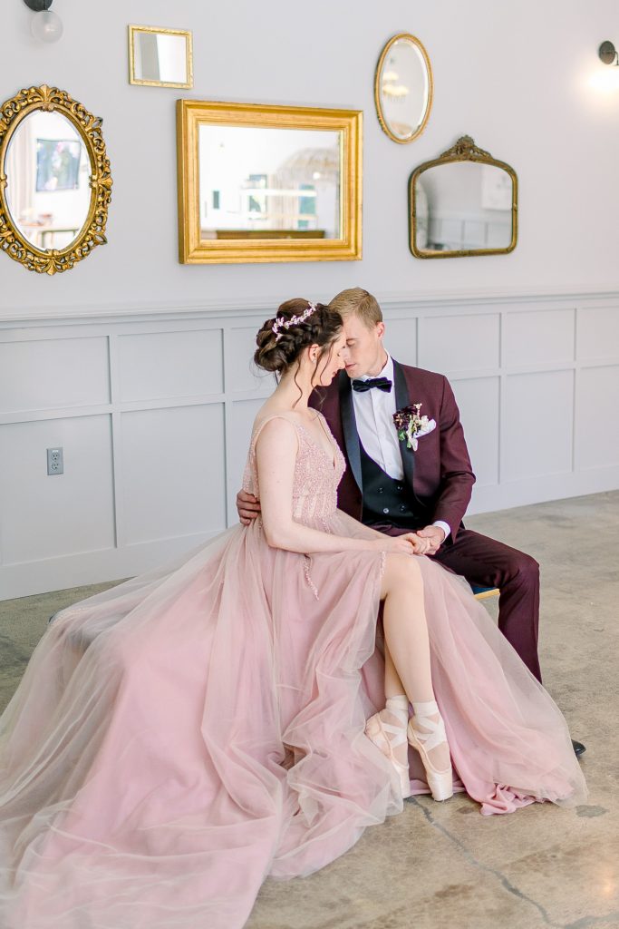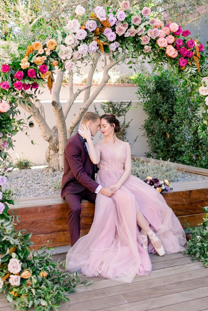 The inspiration came from Elton John and his seminal song Tiny Dancer, blending classical ballet forms with fresh and modern style to create something Sir Elton is sure to love for its deep commitment to fabulousness! This beautiful collaboration by Moose Studio and Alicia C. Creative blends a rich color palette of purple and blush pink, vintage decor, and vibrant flowers by Peonies and Petals! The photo journey by Erin Kaiulani Photo lovingly showcases every sweet detail of this stunning wedding day inspiration!