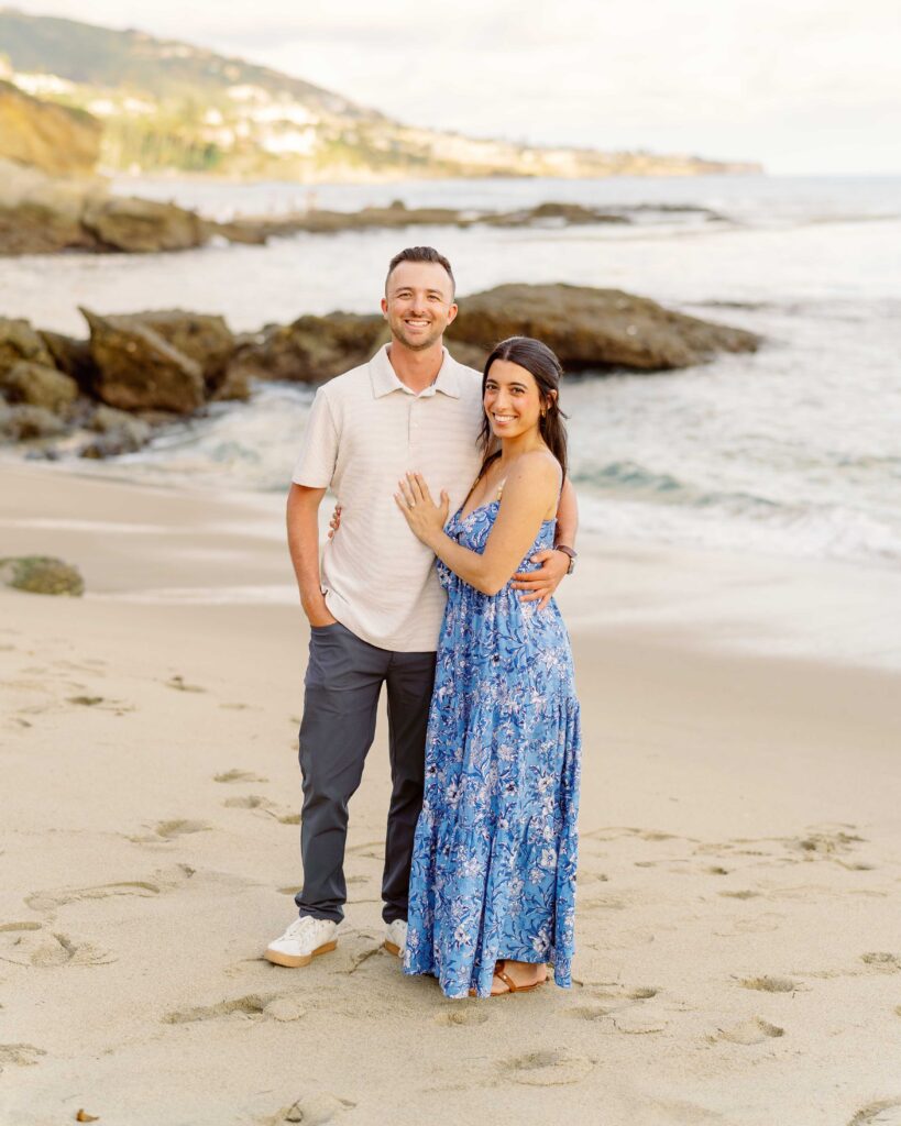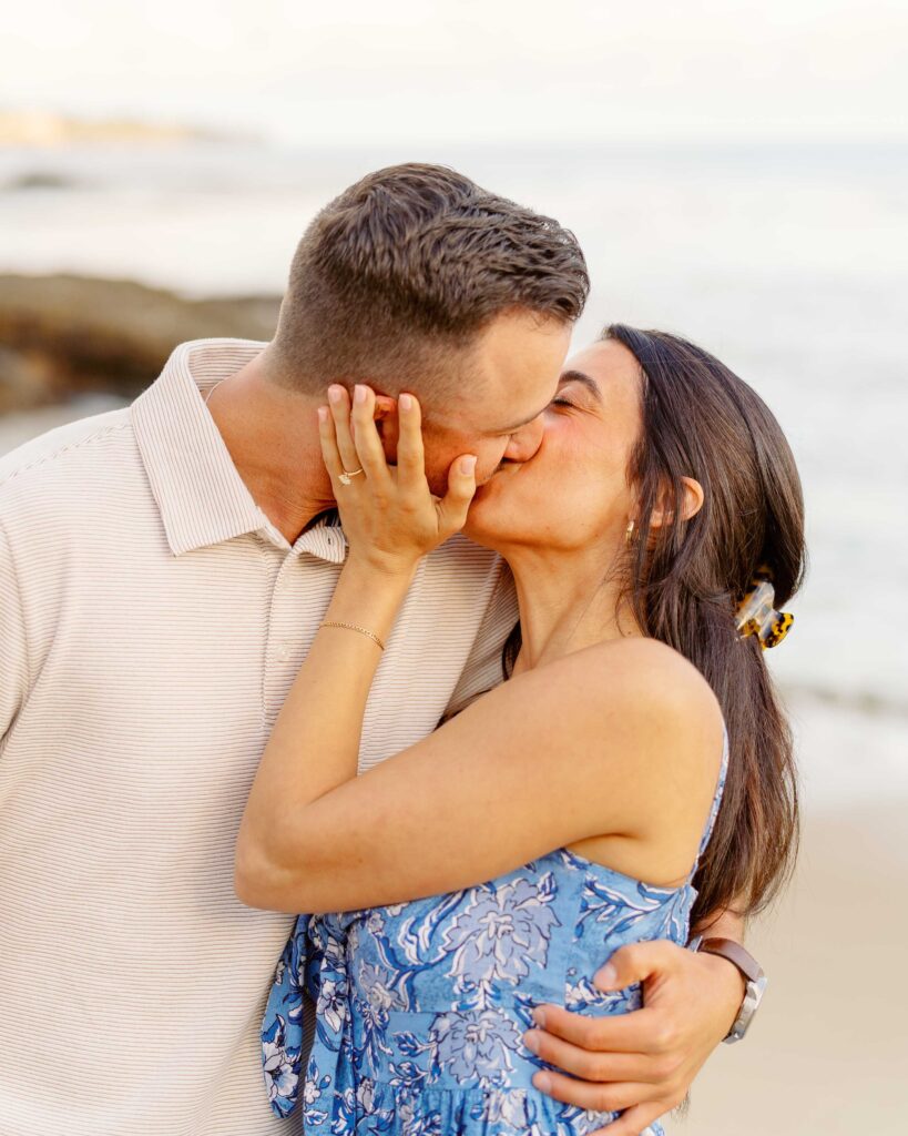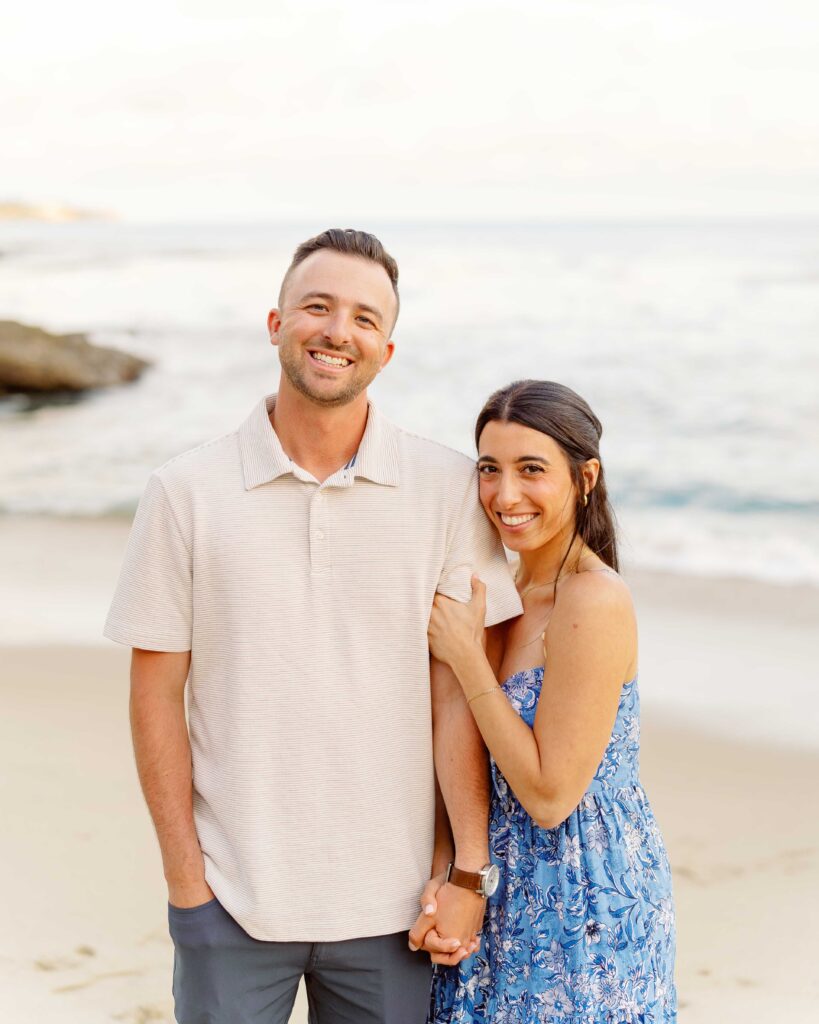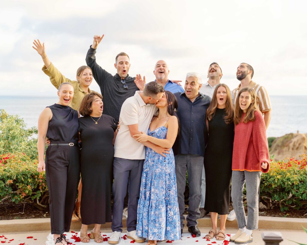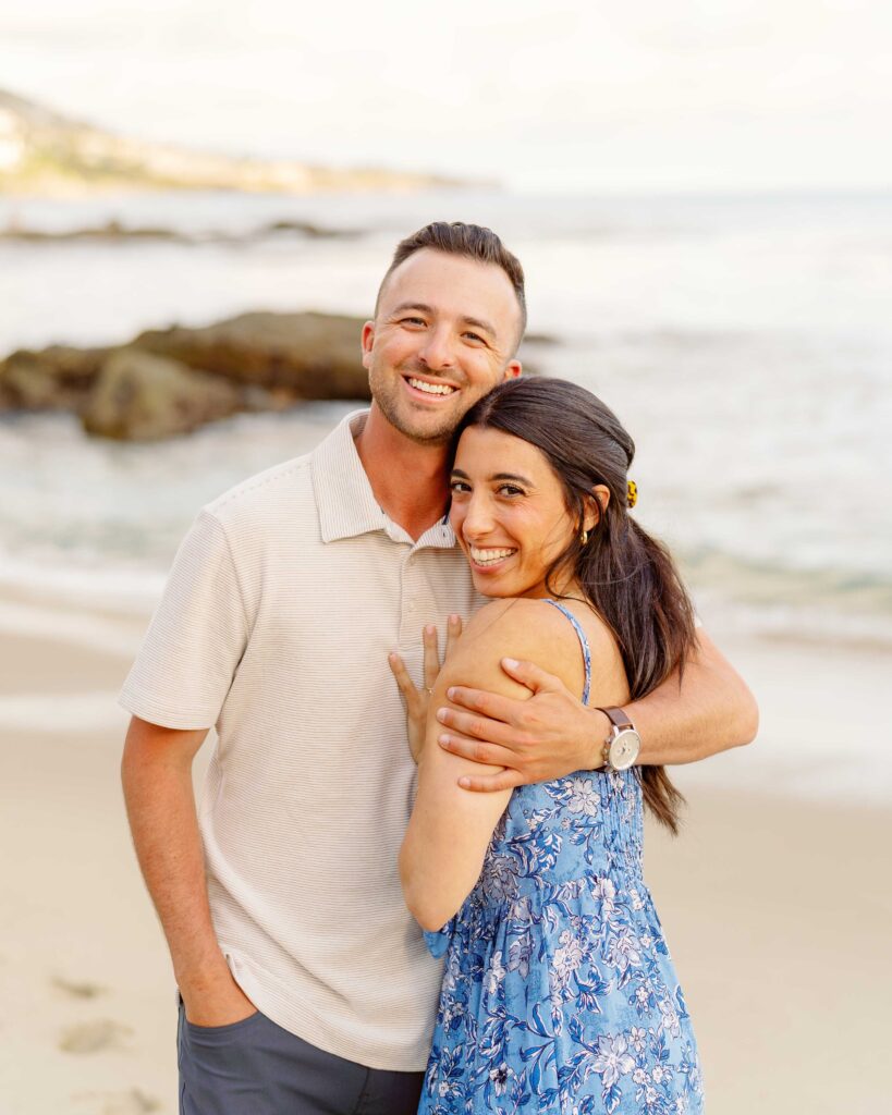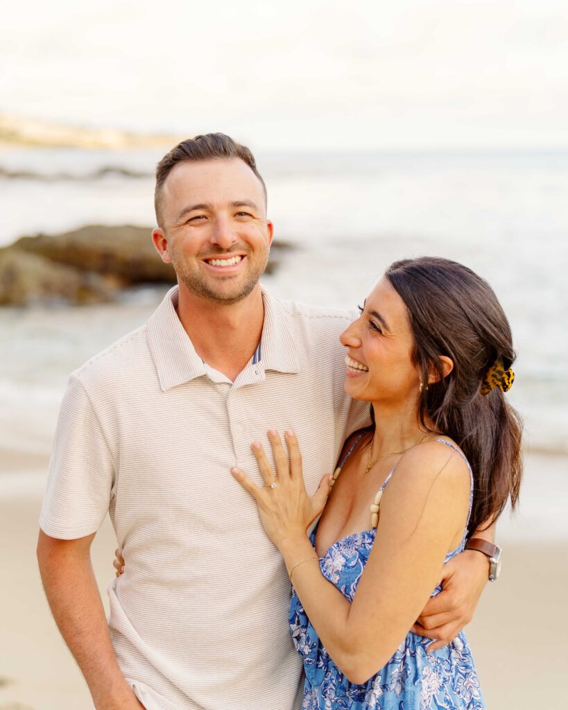 The joy on Mari’s face when Ryan got down on one knee was priceless. Her enthusiastic “yes” was met with cheers from their families, who were watching from a distance. After the proposal, we took a moment to capture the couple’s happiness with a portrait session on the sandy shores of Laguna Beach. The golden hour light was perfect, highlighting their love and the stunning coastal scenery. As a Laguna Beach photographer, capturing such genuine moments is always a joy.