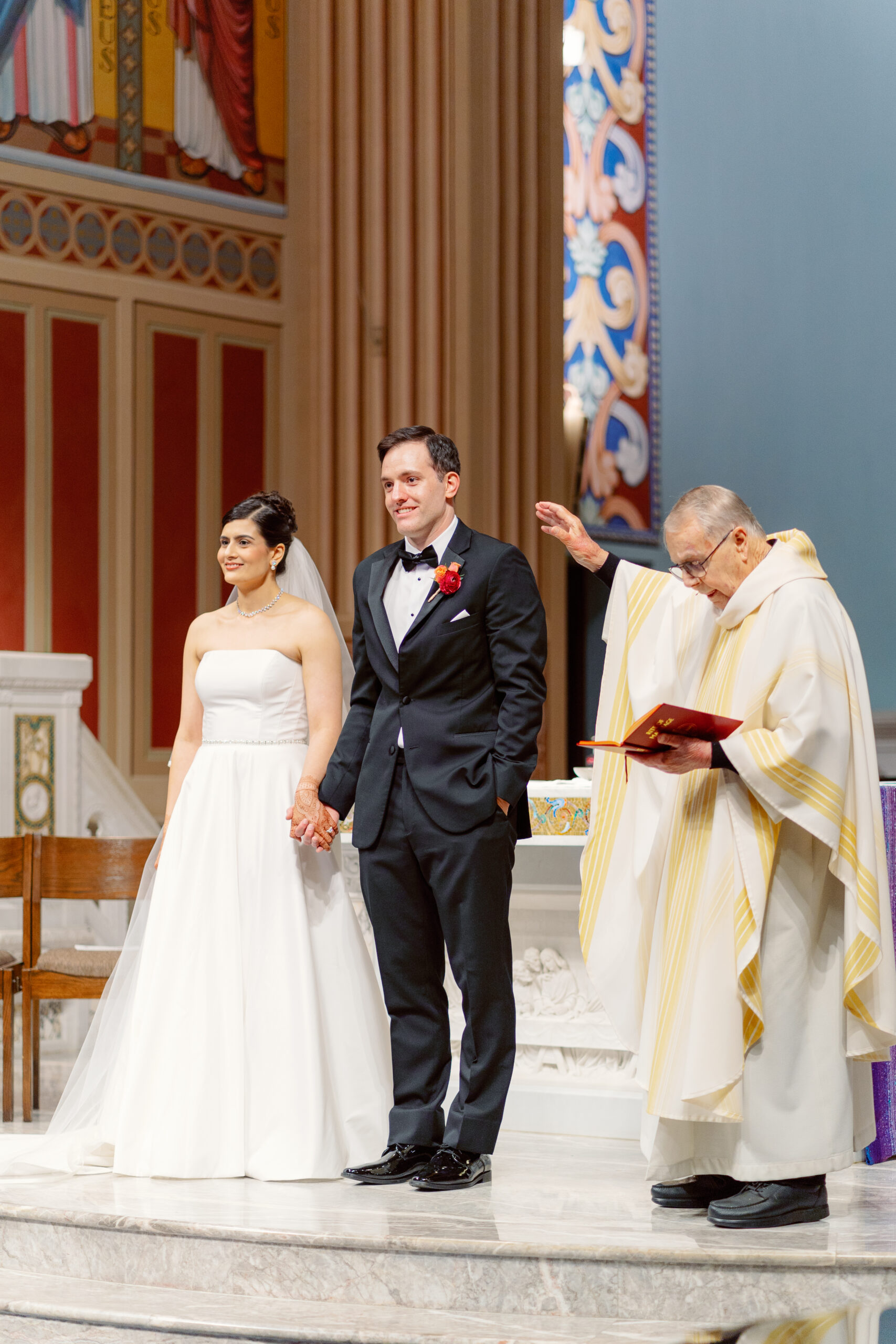 The day began in Santa Monica at the iconic St. Monica Catholic Church, where Vijeta walked down the aisle in a timeless white wedding dress. James stood waiting at the altar with the sweetest expression. The church’s grand architecture and soft morning light made this ceremony feel especially sacred.