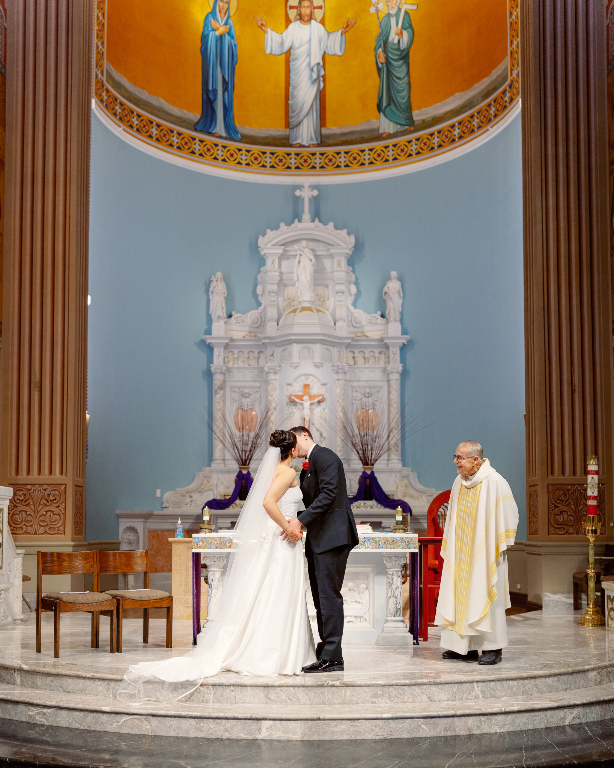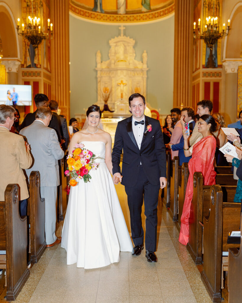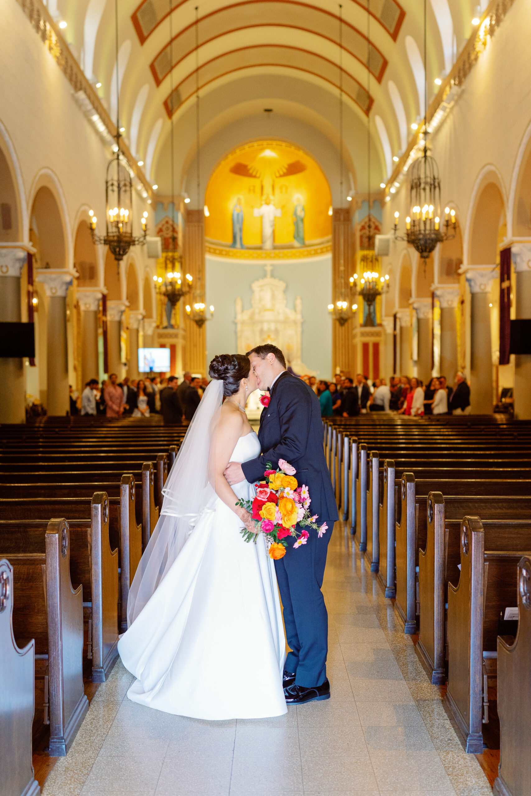 - Walking down the aisle at St. Monica Catholic Church, framed by stained glass and tradition.