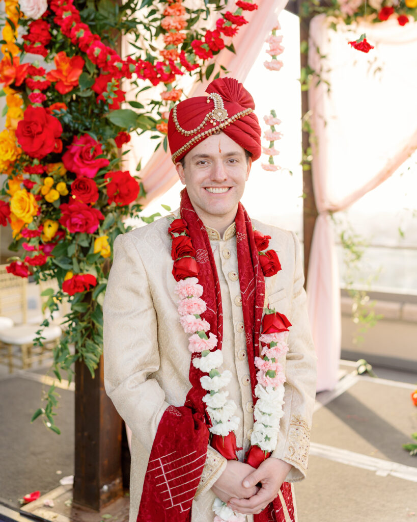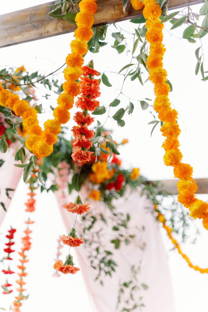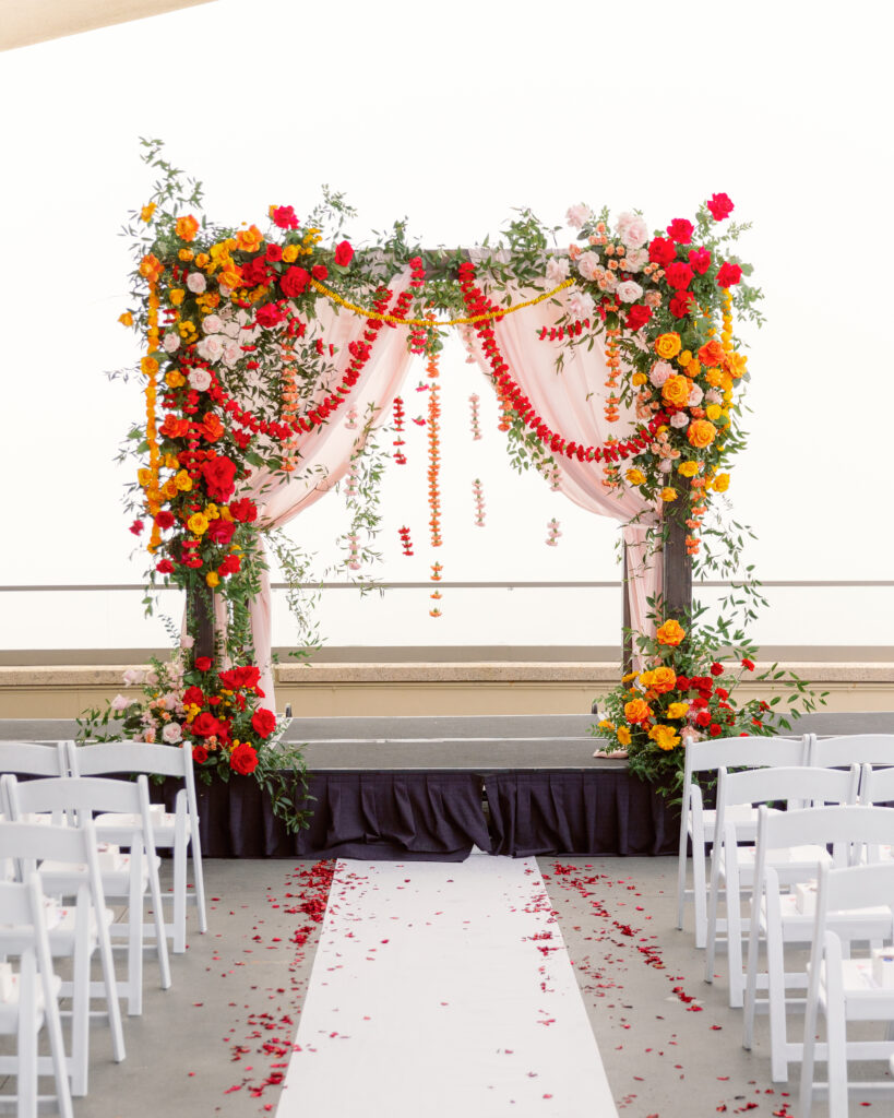 Their rooftop ceremony took place beneath a vibrant mandap bursting with pink, orange, and yellow florals. With the ocean breeze and skyline in the background, it felt like a celebration in the clouds. They exchanged garlands, laughed through the traditions, and soaked in every second.