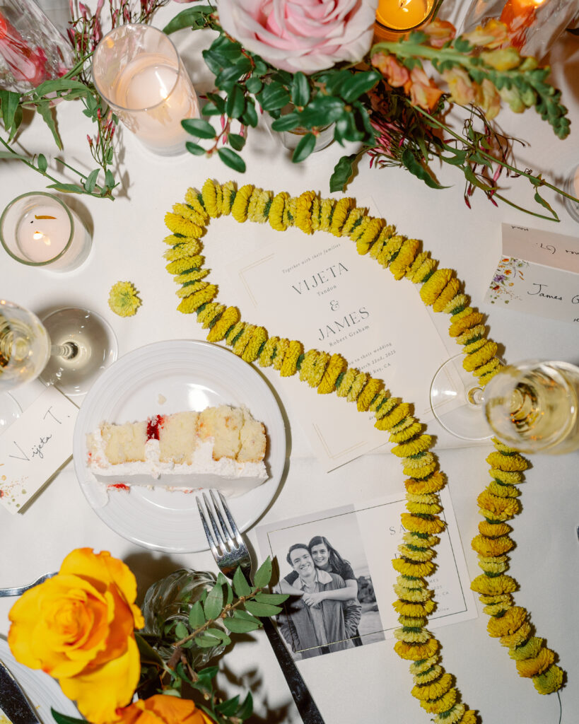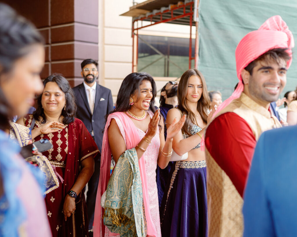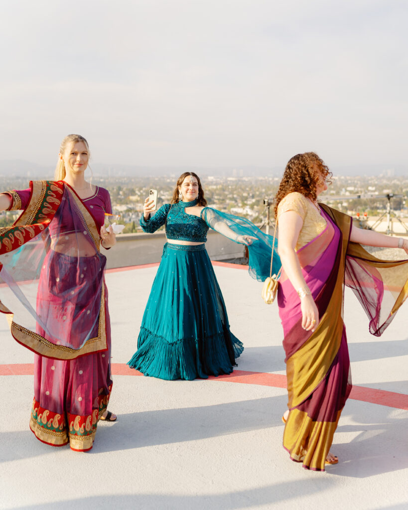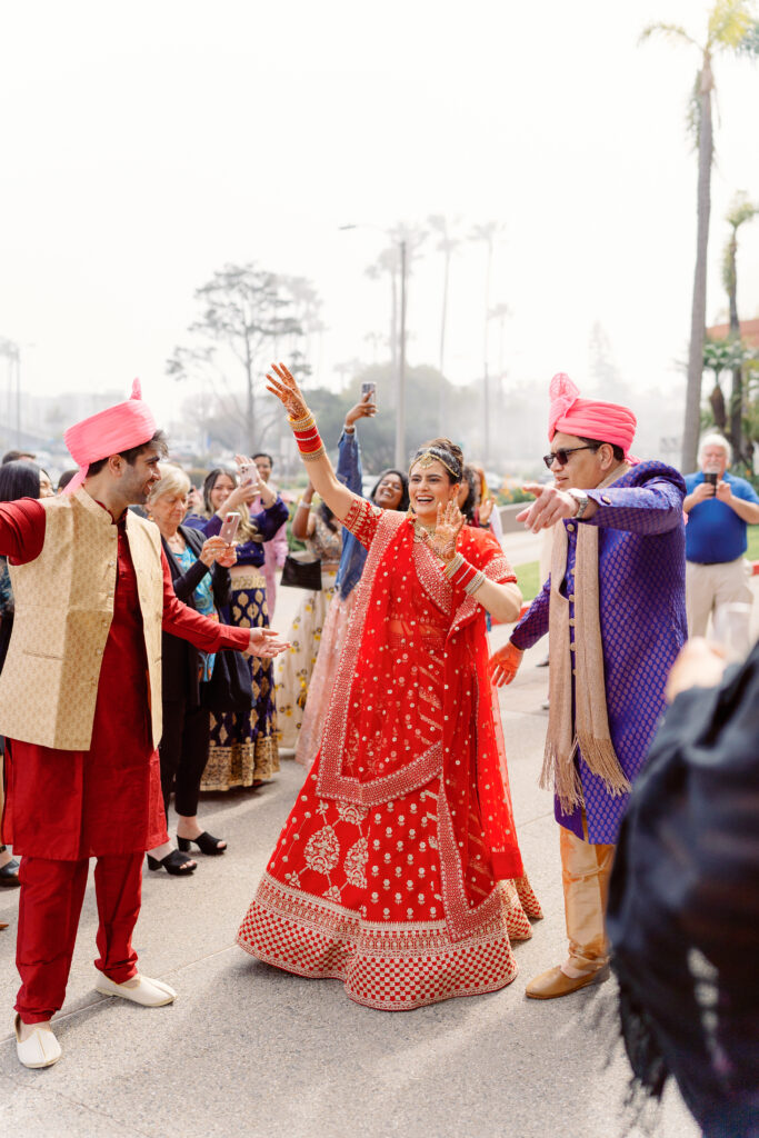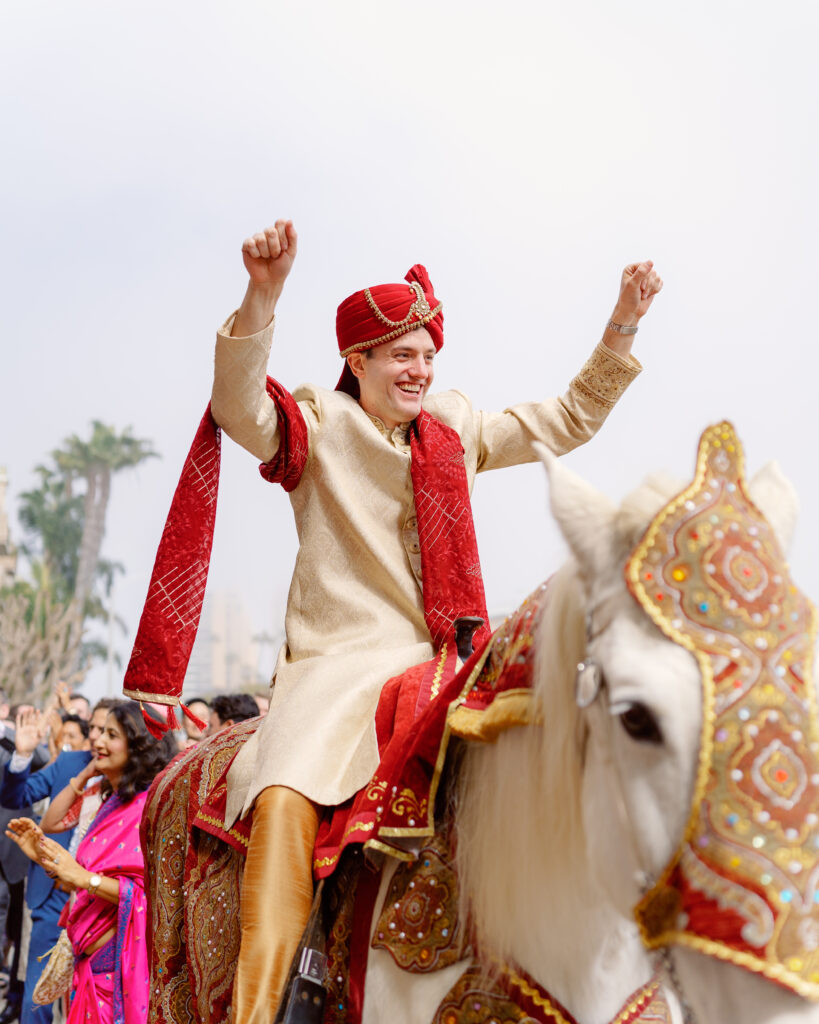 Afterward, they changed into traditional Indian attire and joined their guests at the Marina Del Rey Marriott. The mood shifted from serene to electric as James arrived on horseback for his baraat. Music led the way while friends and family danced in colorful saris. Vijeta, now in her stunning red lehenga, met him with a huge smile as she guided the horse through the crowd — it was one of those moments that felt like pure joy.